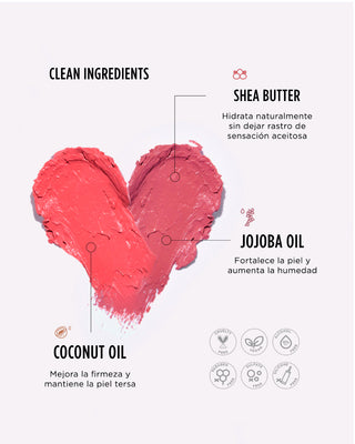 Tonos naturales: Disponible en 4 tonos; un color de apariencia natural para lograr un efecto de piel enrojecida - cherry bomb, rosado - dusty petal, durazno - peach pink y bronceada - cappuccino.